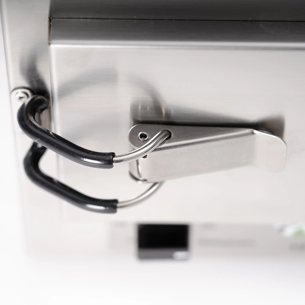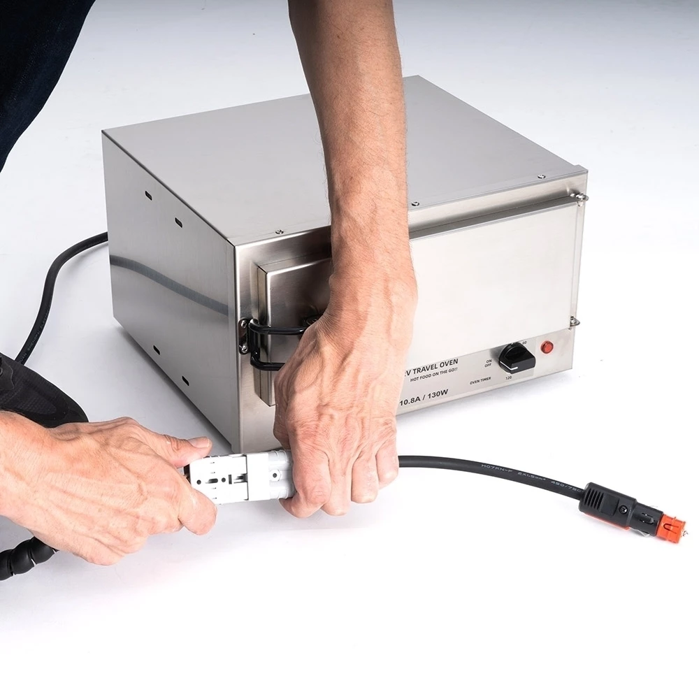 This oven can be powered via the 21cm-long cigarette lighter plug, however, for the safest and most reliable connection, it’s recommended to use the included 1m-long 50Amp Anderson plug. The oven will draw 10.8 Amps/130 Watts when it’s cranked to its 180°C maximum and has a lower temperature range all the way down to 0°C. The element is enclosed within the bottom of the oven and heat is transferred throughout with the conduction of metal and convection in the air. Inside the oven are 2 x removable stainless steel wire racks and 1 x stainless steel grill tray. There are also 2 mounting brackets that slot into either side of the oven and can be screwed into a stable surface for secure and permanent mounting.