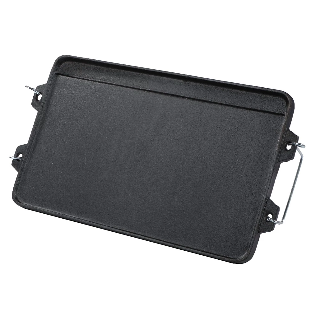 This reversible cast iron fry pan is ideal for use over most 3 burner stoves or a campfire and has a grill plate on one side and a flat plate on the other for versatility. The rectangular shape will retain heat efficiently so you can enjoy that great natural BBQ flavour with your food.