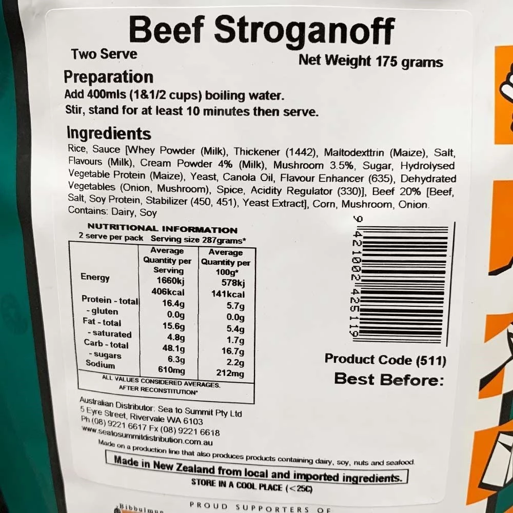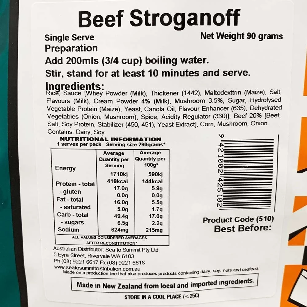The Back Country Cuisine Beef Stroganoff is a Russian classic comprised of beef pieces and mushrooms in a sour cream sauce served with rice for a hearty meal on a lightweight adventure.