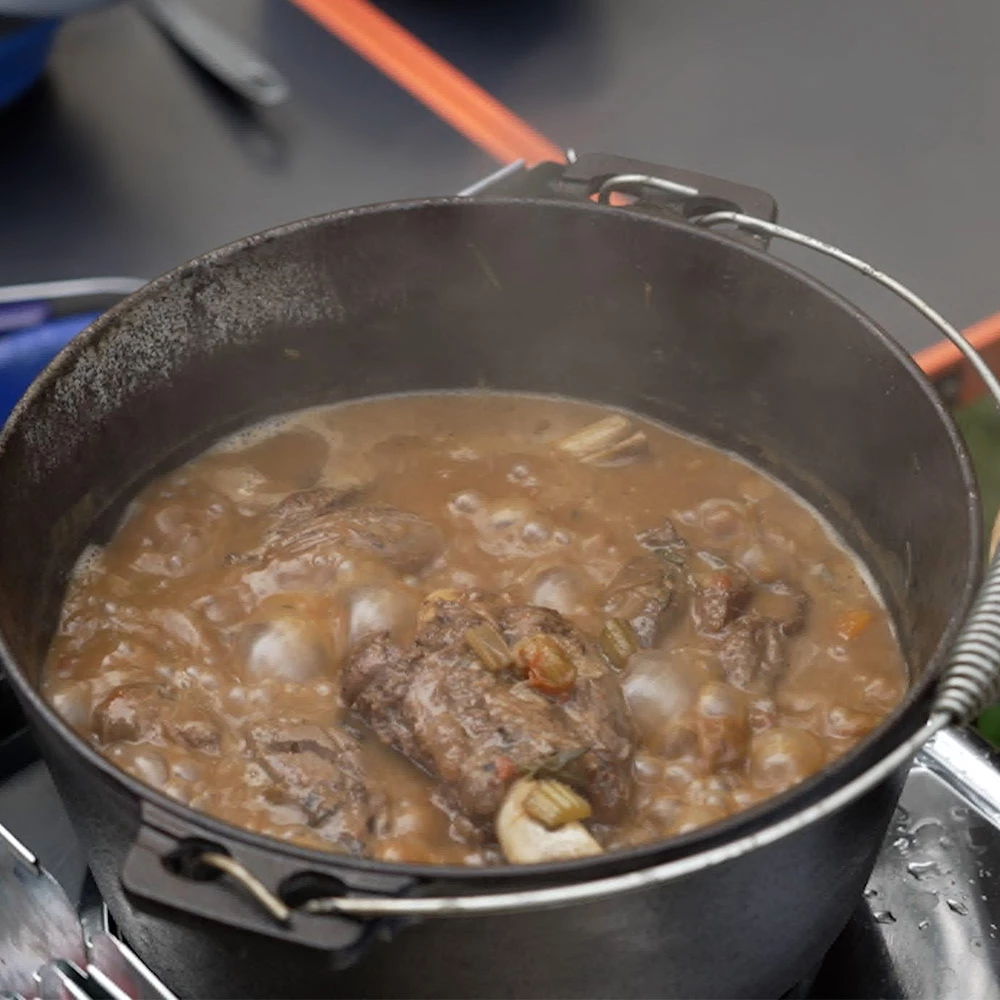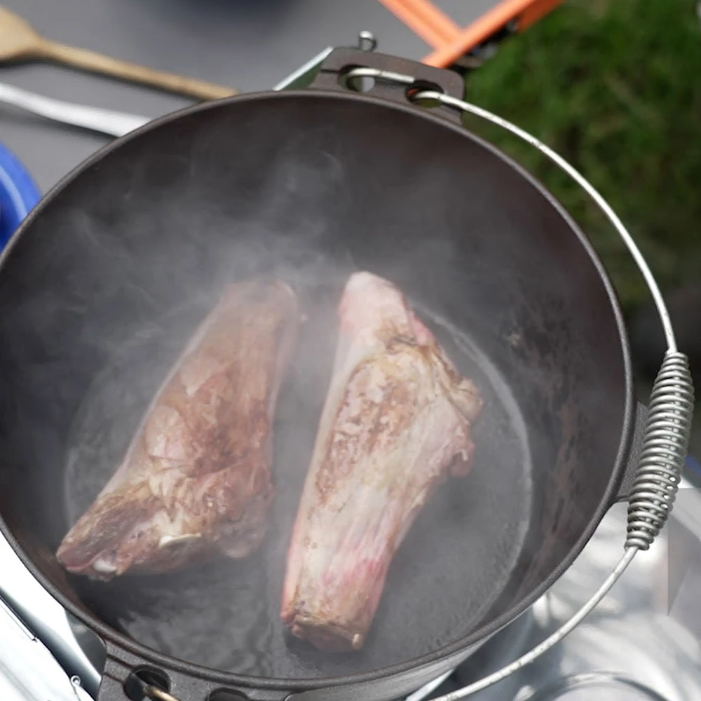 Made with solid pre-seasoned cast iron and featuring a flanged lid to keep coals on top, and a spiral carry handle that makes carrying a full camp oven comfortable.