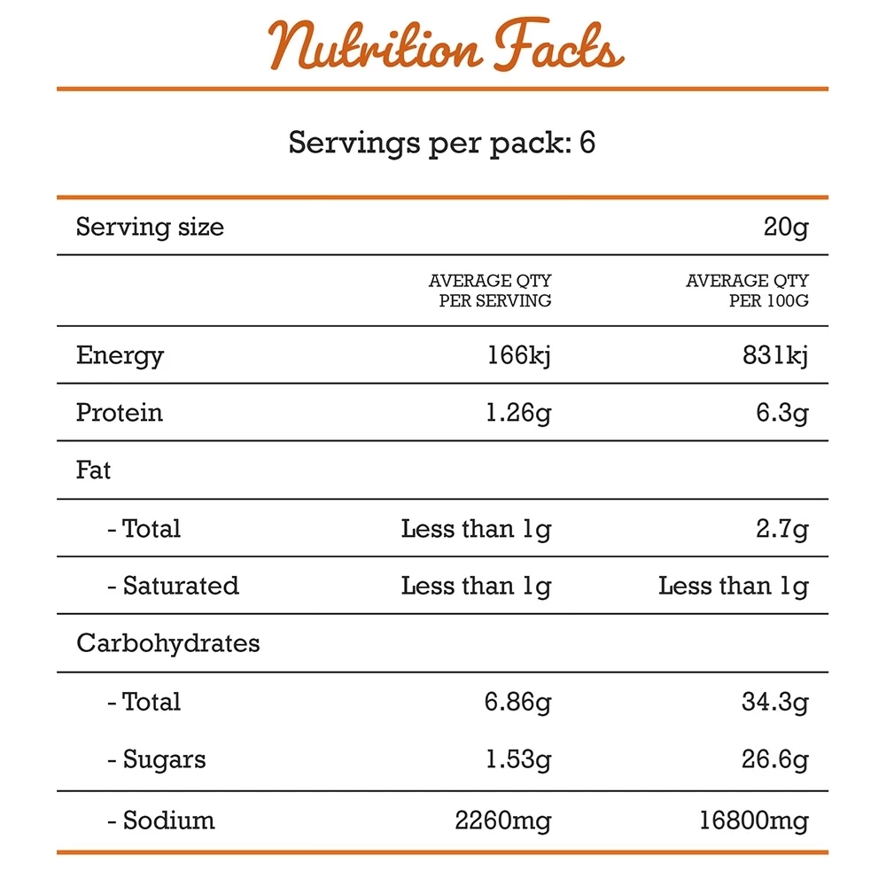 Ingredients: Salt, Sugar, Hydrolysed Vegetable Protein, Spices, Dehydrated Vegetables, Anti-caking Agent (551), Spice Extract Paprika (160c).