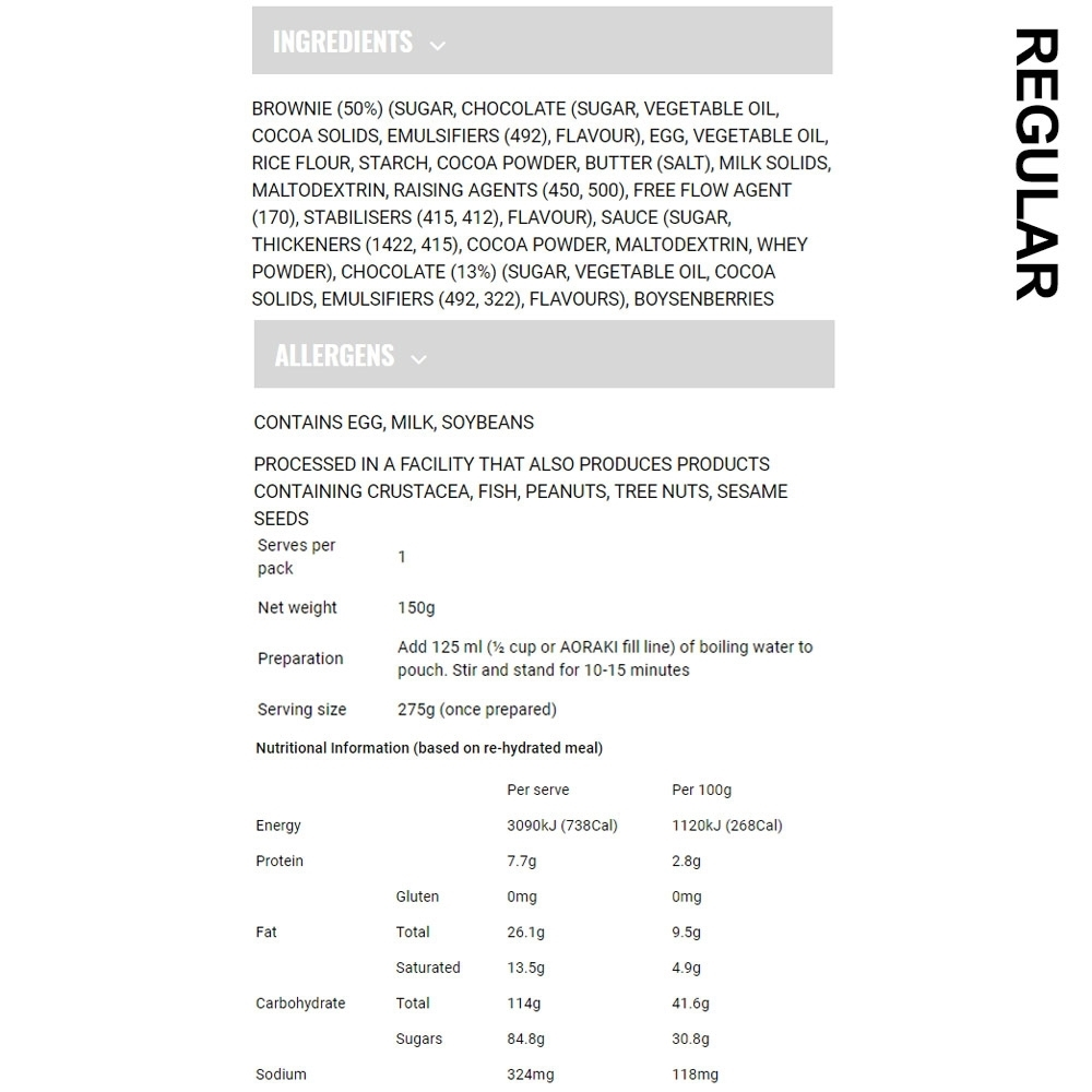 - Ingredients: Brownie (50%) (sugar, chocolate (sugar, vegetable oil, cocoa solids, emulsifiers (492), flavour), egg, vegetable oil, rice flour, starch, cocoa powder, butter (salt), milk solids, maltodextrin, raising agents (450, 500), free flow agent (170), stabilisers (415, 412), flavours), sauce (sugar, thickeners (1422, 415), cocoa powder, maltodextrin, whey powder), chocolate (13%) (sugar, vegetable oil, cocoa solids, emulsifiers (492, 322), flavours), boysenberries