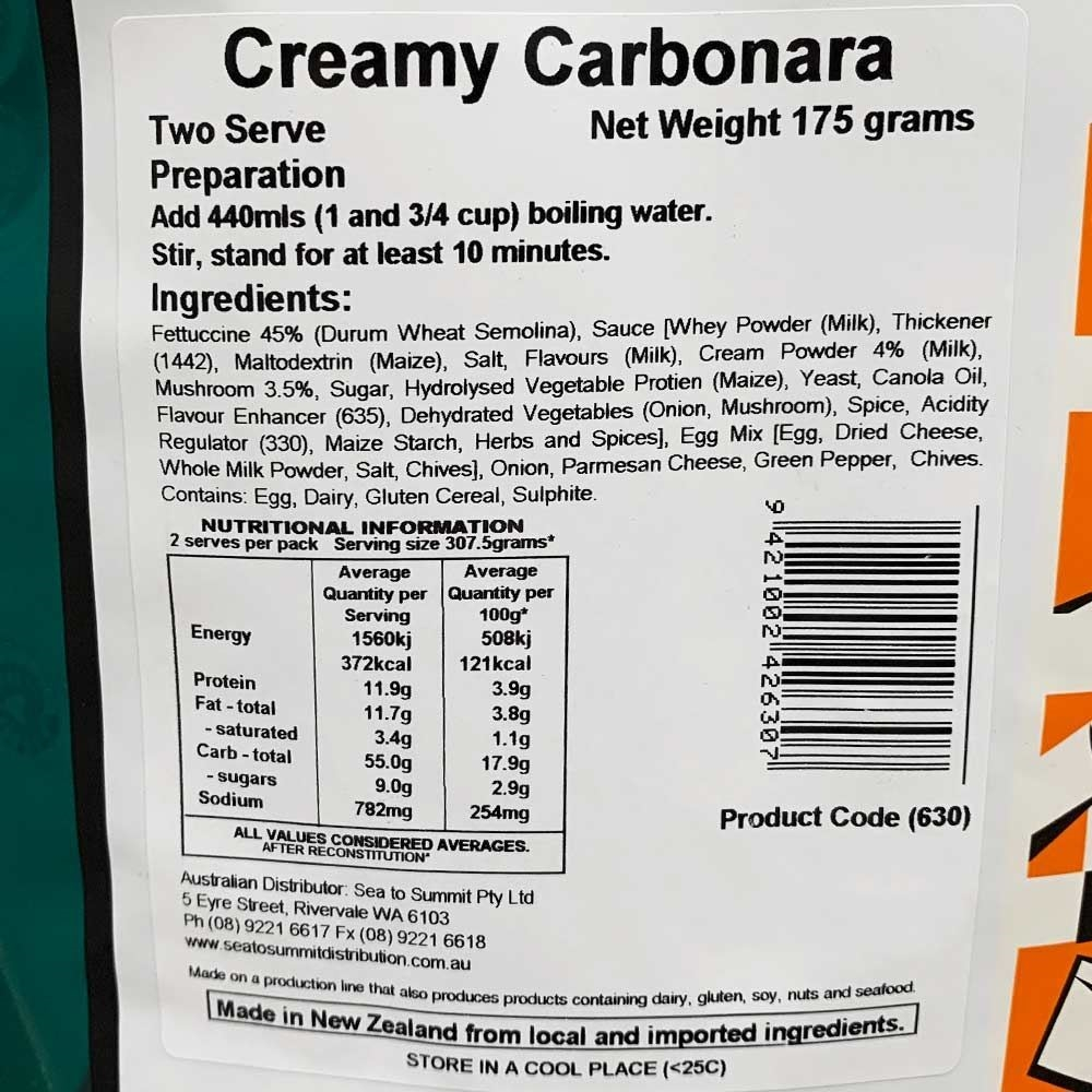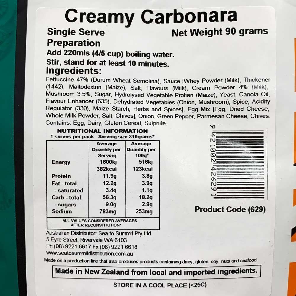 - Ingredients:Â Fettuccine 47% (Durum Wheat Semolina), Sauce [Whey Powder (Milk), Thickener (1442), Maltodextrin (Maize), Salt, Flavours (Milk), Cream Powder 4% (Milk), Mushroom 3.5%, Sugar, Hydrolysed Vegetable Protein (Maize), Yeast, Canola Oil, Flavour Enhancer (635), Dehydrated Vegetables (Onion, Mushroom), Spice, Acidity Regulator (330), Maize Starch, Herbs and Spices], Egg Mix [Egg, Dried Cheese, Whole Milk Powder, Salt, Chives], Parmesan [(Milk, Starter Culture, Non-Animal Rennet, Salt, Lipase), Tapioca Starch, Rice], Onion, Green Pepper, Chives