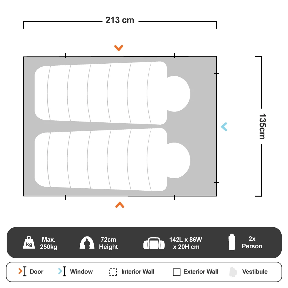 This cot is designed for two people, and is longer than a queen-sized bed and almost as wide. Constructed from heavy duty nylon, with No-See-Um mesh on the windows and doors for insect protection and ventilation, a powder coated frame for durability, and fully taped seams for water protection. This elevated design keeps you off the cold or damp ground, and away from the insects or other wildlife as well. It only takes seconds to set up by just one person, and also converts to a lounge chair or standard cot for extra versatility.