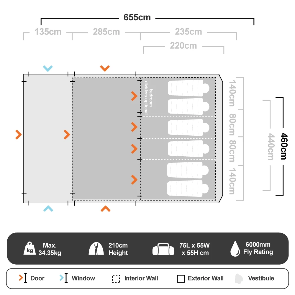 Bringing SeroLink™ beam technology to the forefront, you get a lightweight system that reduces bulk without compromising durability and portability. With the tunnel design and angled beam construction, you also get improved headroom, rigidity and wind performance, plus the zip-out dividers mean you can customise your bedroom layout and create up to 4 private quarters for sleeping 6 people in comfort. The TXL V2 is constructed with 68D, torrential rain tested fabric that’s UV SPF 50 rated, plus breathable and TPU tape seam-sealed, then the fly adds further protection through 150D, 130T poly oxford. 15 ventilation points, including 5 external windows, 3 tent entry/exit points, and your main awning entry/exit point give you all the versatility you need to keep the whole family comfortable and happy.