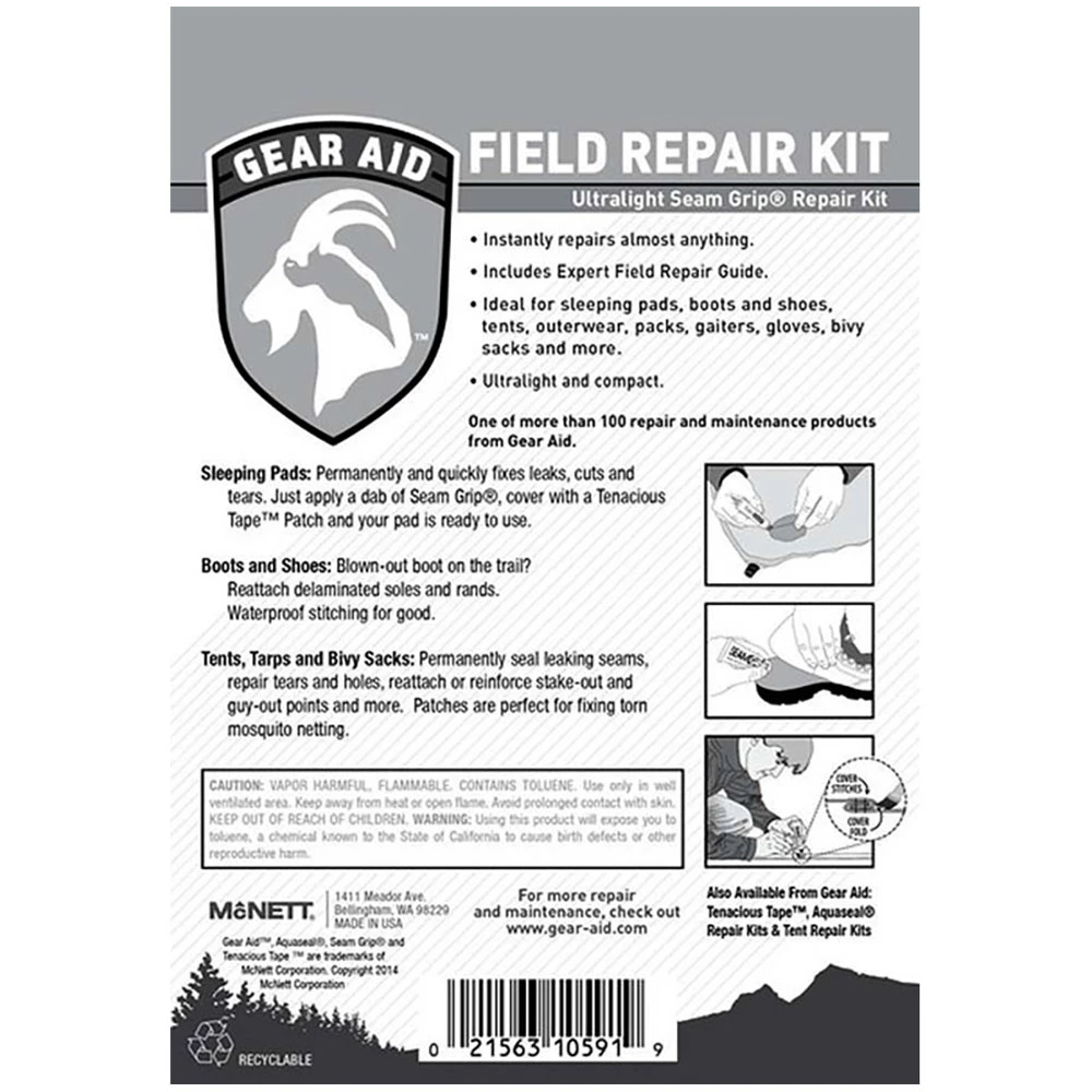 - Includes: one tube of seam grip seam sealer and repair adhesive, one fabric and one clear patch, application brush and expert field repair guide
