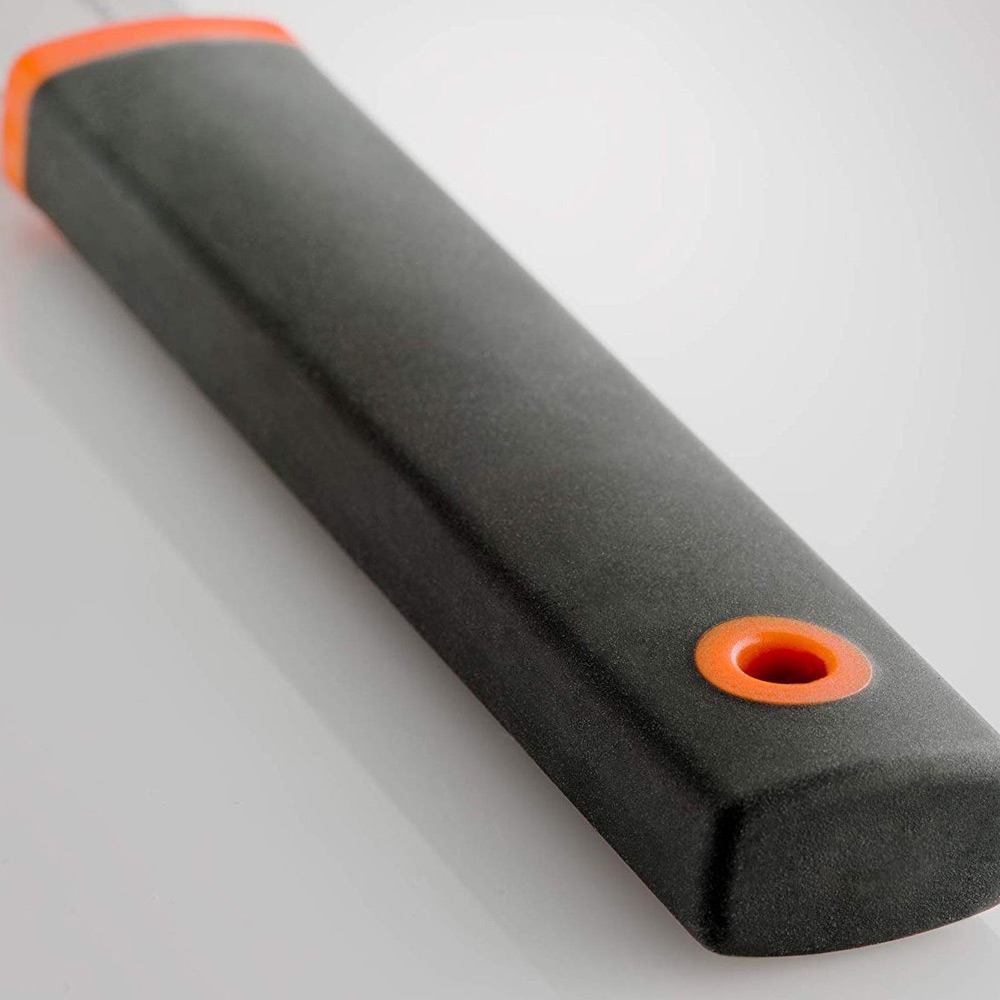 This compact knife is made from stainless steel and is perfectly rockered for chopping, with an ergonomic rubber handle for a steadfast grip. When you’re not using it, this knife can be stashed away into the included protective sheath to keep it nice and sharp, and to ensure safe handling.