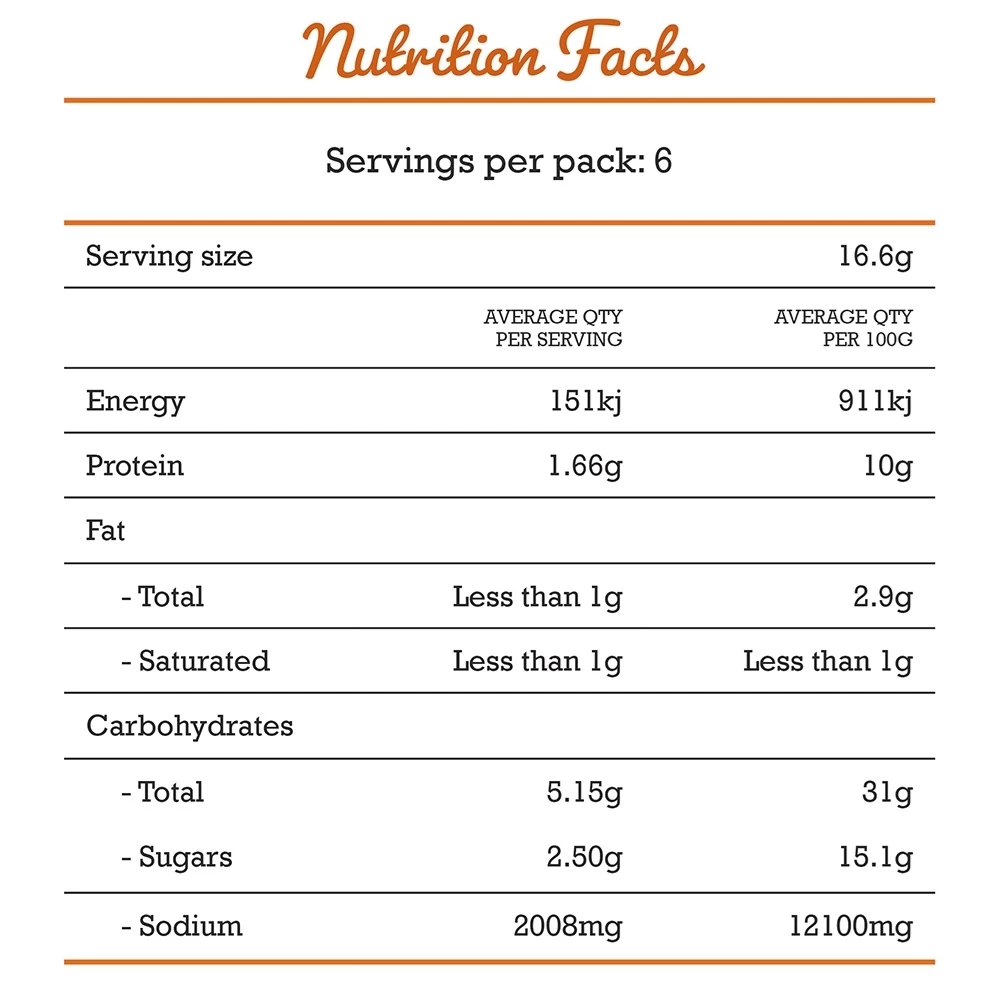 Ingredients: Salt, Spices, Herbs, Hydrolysed Vegetable Protein, Sugar, Dehydrated Vegetables, Anti-caking Agent (551).