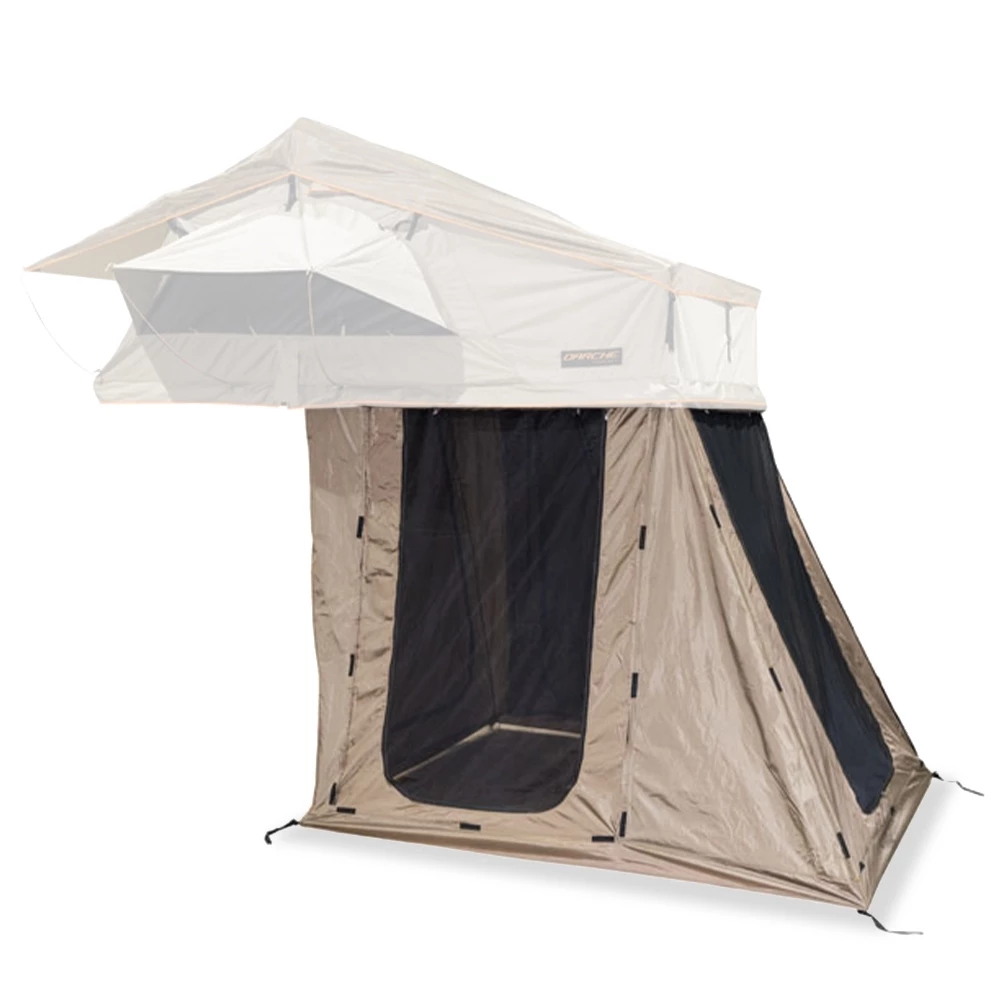 This annex is constructed from 210 denier oxford polyester ripstop with 550gsm PVC zip off bucket floor which also has corner points that are adjustable. It’s got 3 entries each with both superfine insect mesh and privacy doors plus a rear opening so you can get to your vehicle easily. If you want to set up further shade, convert the privacy doors into an awning using some separately available telescopic alloy poles. Designed to suit a wagon or camper trailer set up, this Annex is designed to be used with the separately available Hi View or Panorama 1600 roof top tents from Darche.