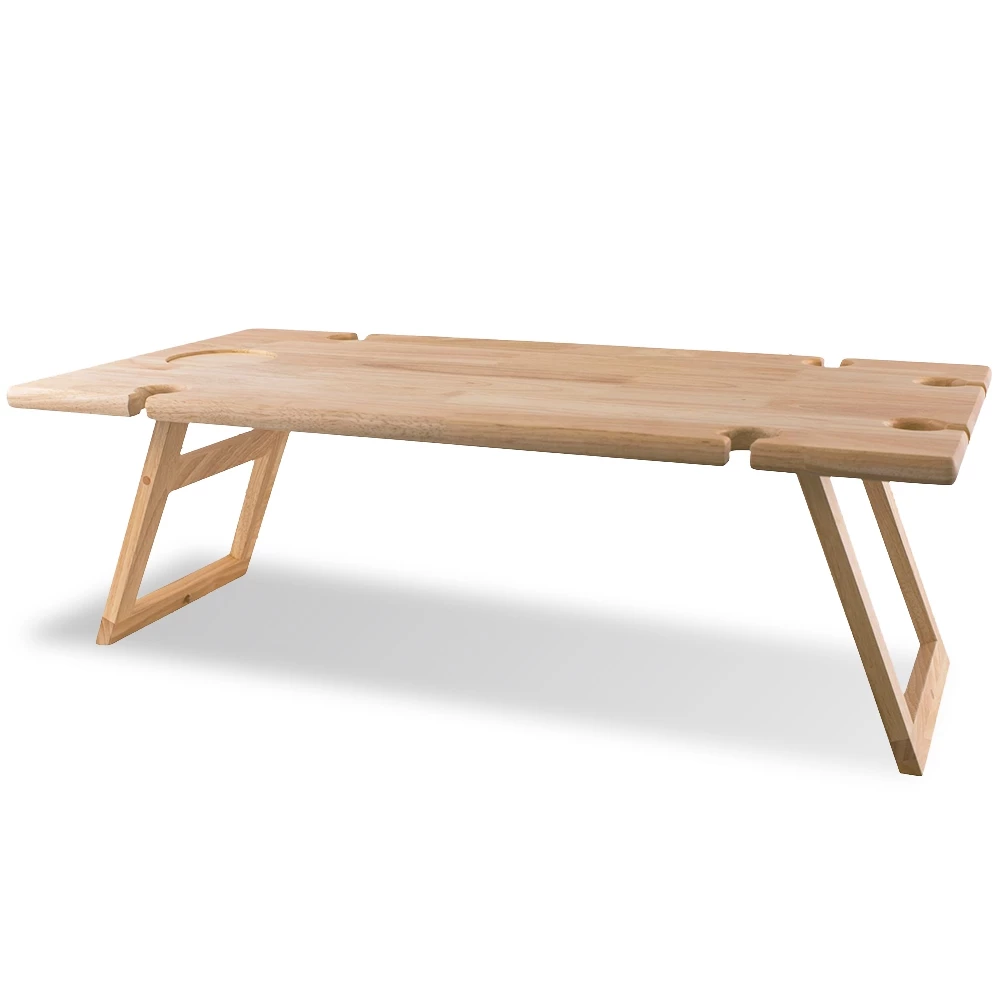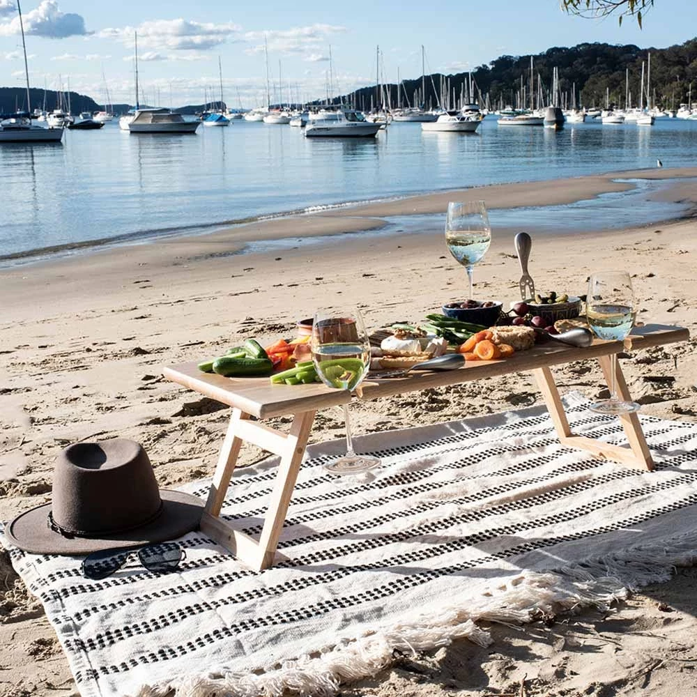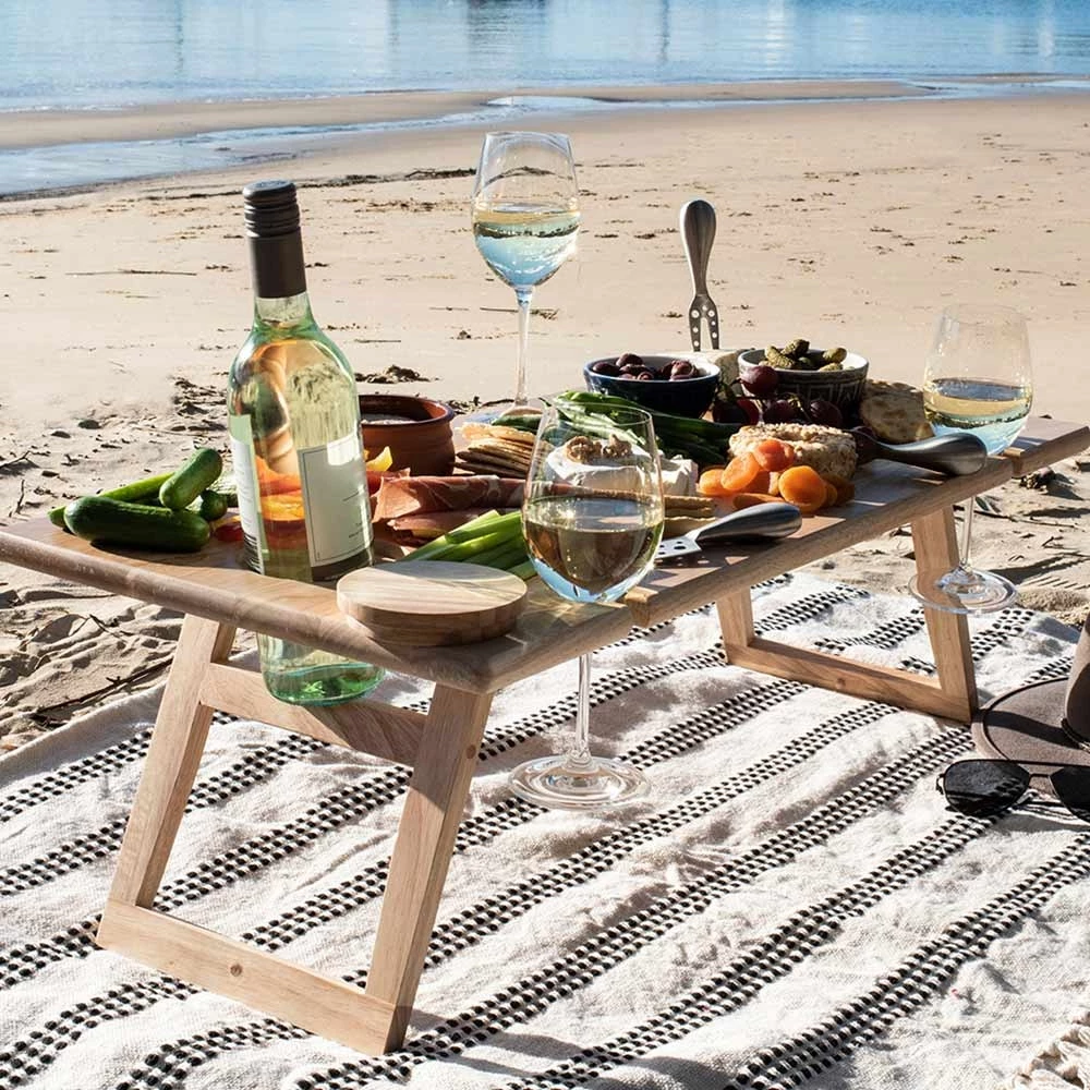 With a flawless rubberwood construction and a portable design, this table is the perfect pop-up flattop for the smorgasbords by the sea. Be it a group gathering, or simply toasting to the two of you – hold up to six wine glasses and prop the wine bottle in the holder, thanks to the removable plug. From sticky quince to creamy brie, clean easy and store snug thanks to fold-down legs for easy pack up.