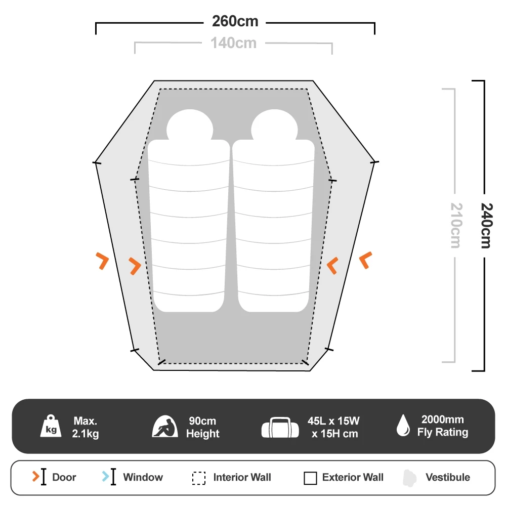The Mantis UL 2 allows enough room under the vestibules for you to store your boots or other dirty gear out of the way and has internal storage pockets to keep your valuables within arm’s reach. For a low-profile and reliable tent that’ll shelter you after a rugged day on the track, you can’t go past the Mantis Ultralight 2 Hiking Tent from BlackWolf.Â