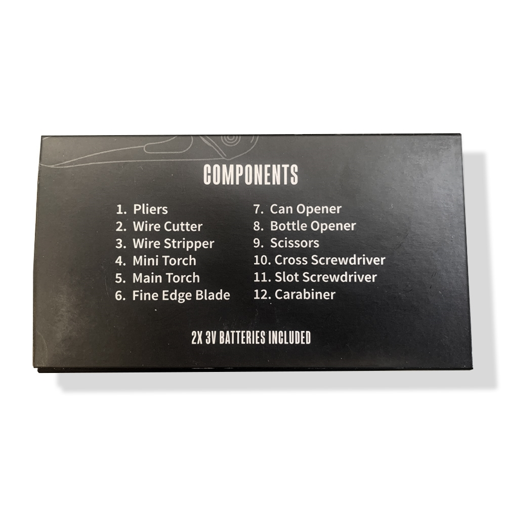 - Includes pliers, wire cutter, wire stripper, mini torch, main torch, fine-edged blade, can opener, bottle opener, scissors, cross screwdriver, slot screwdriver, carabiner