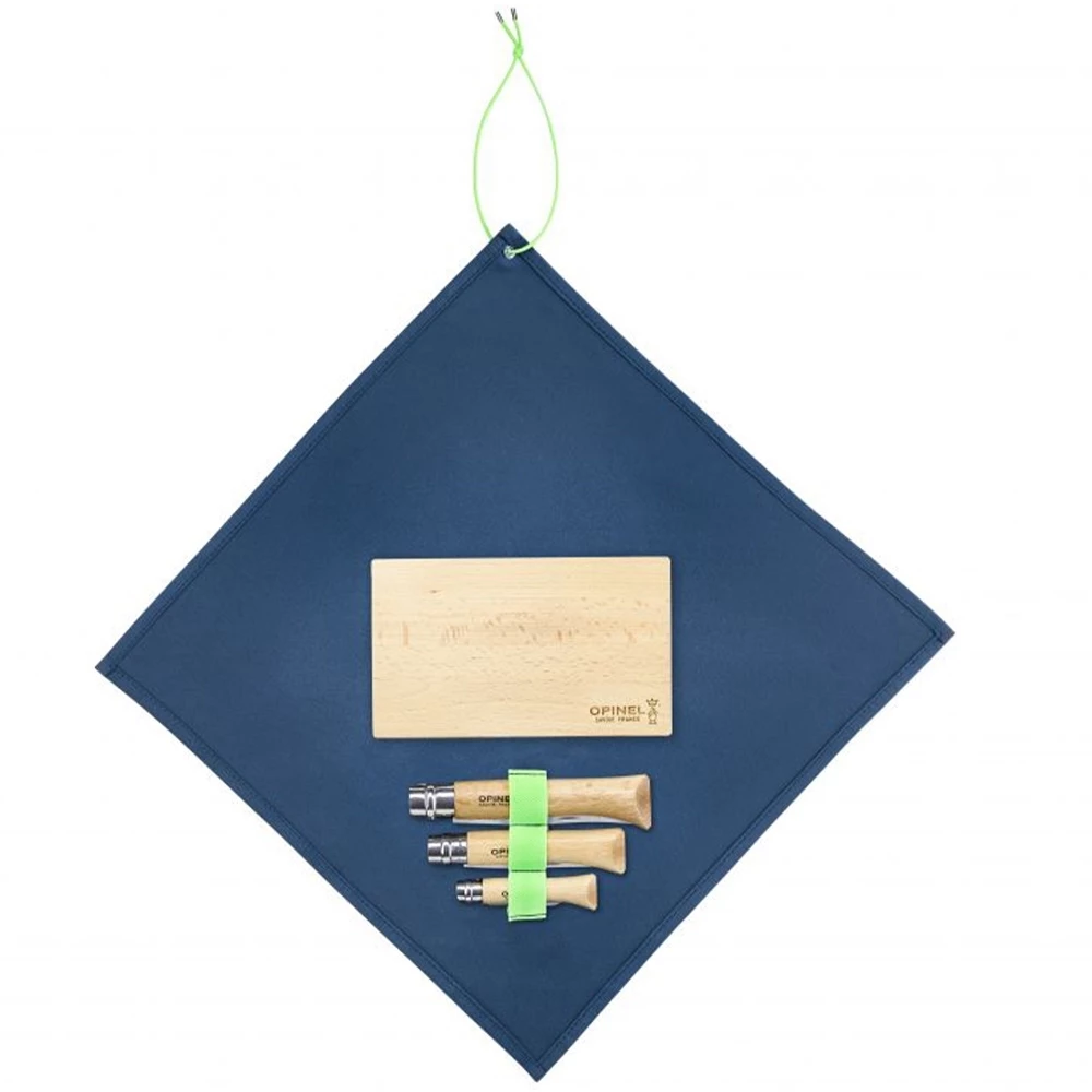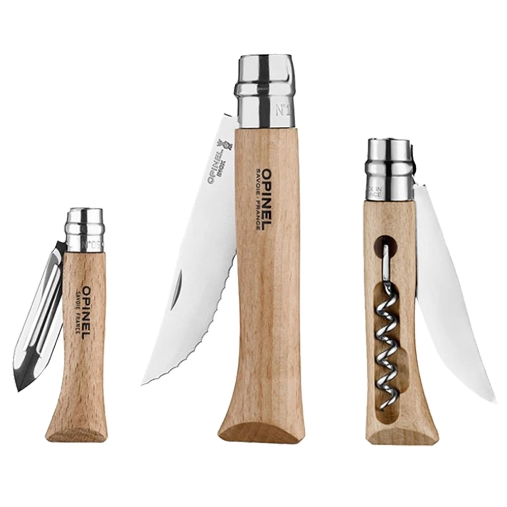 - Includes: N°10 folding corkscrew knife, N°12 folding knife with a serrated 12cm blade, N°06 pocket peeler, beechwood cutting board, and microfibre dish towel doubling as a travel pouch