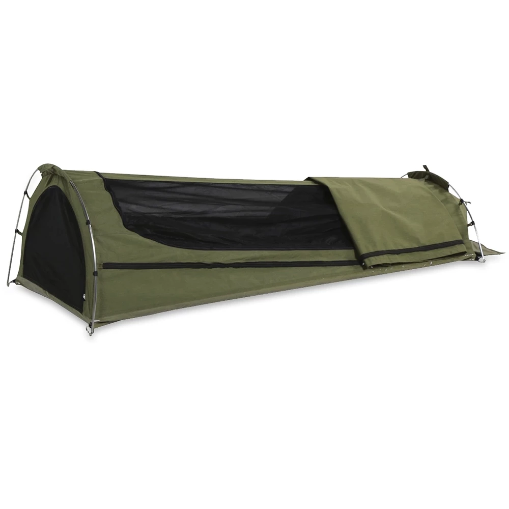 Made from durable 230gsm ripstop canvas, and a heavy-duty PVC vinyl base – you’ll be protected from what the elements throw at you in this shelter.  This swag has a 2 pole dome design that gives 55cm of generous head height, and high-quality Durallium 7001 alloy poles for structure.