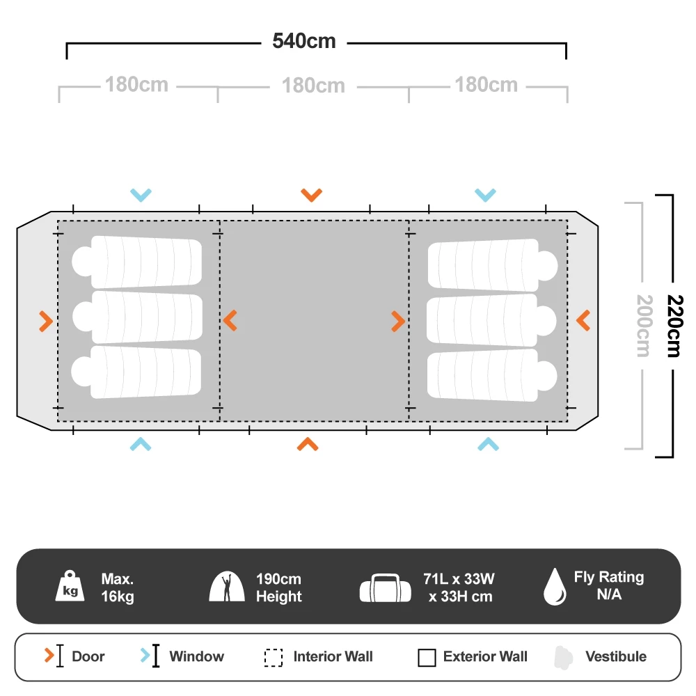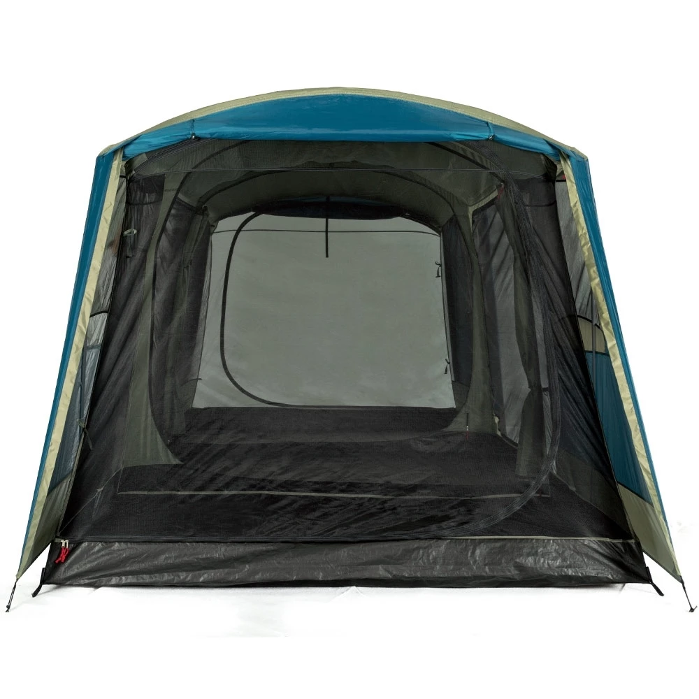 The oversize D doors in the middle and at both ends of the tent allow for easy multi-point access, which also minimises tripping. The large side, rear and front awnings provide plenty of shade for relaxing outside when the sun is shining, and when set up allow maximum breeziness throughout the tent. The bucket-style heavy-duty PE floor keeps ground-level moisture and water out, so that’s one less thing to worry about if the weather turns sour, and the tent fly is made from a silver-coated fabric for extra strength and protection.