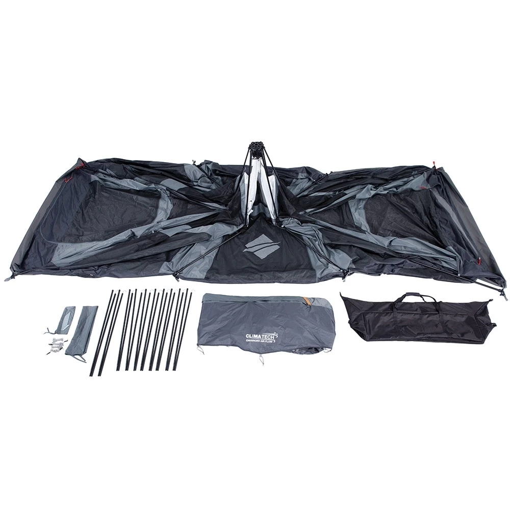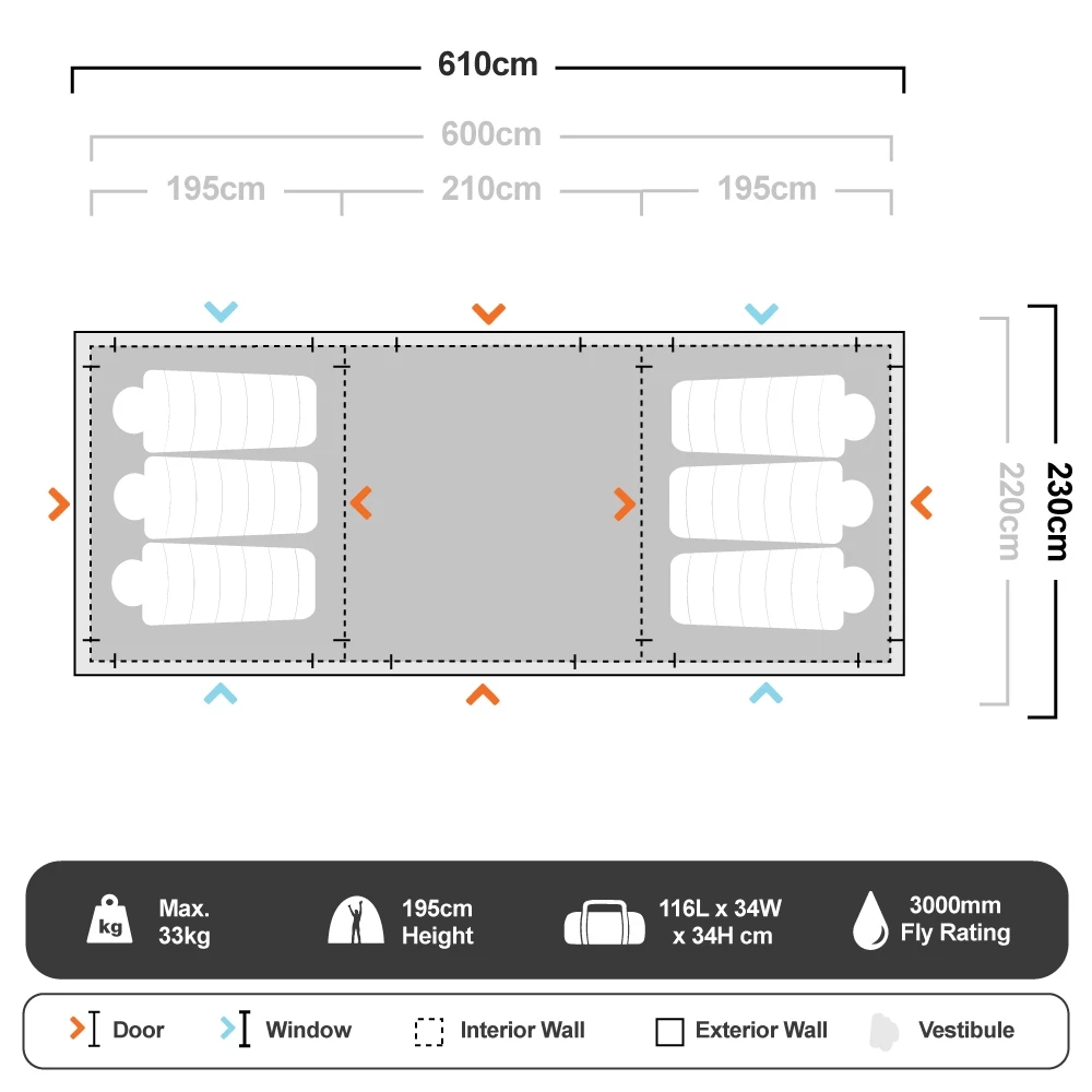 This baby is a whopping 6m long giving plenty of room for a small battalion’s worth of kids. There are 3 large bedrooms or keep the centre one for a communal living space, but each area is sized to fit queen and double stretchers and airbeds. It’s got a full side awning with removable windbreaks, and the interior room dividers can be zipped up or open depending on your needs. ClimaTech vents enhance the airflow, and with No-See-Um Mesh panels and large front, rear and side doors, you’ve got excellent ventilation throughout. There’s also improved headroom through the Triple Hub Frame system that works to increase internal space and strength as well.