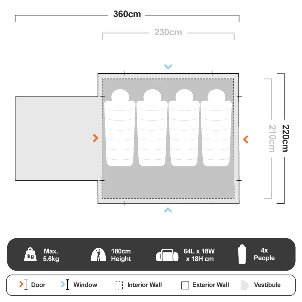 The fly has been treated with a silver coating which will reflect the heat while also adding an extra element of protection in adverse weather. You can easily illuminate your tent at night by attaching an optional light to the lantern hook in the centre of the tent, and you can keep your valuables separated from the rest of your gear thanks to the handy organiser pockets. For camping newbies, groups on a budget and the like- the OZtrail Tasman 4V is a great option.Â