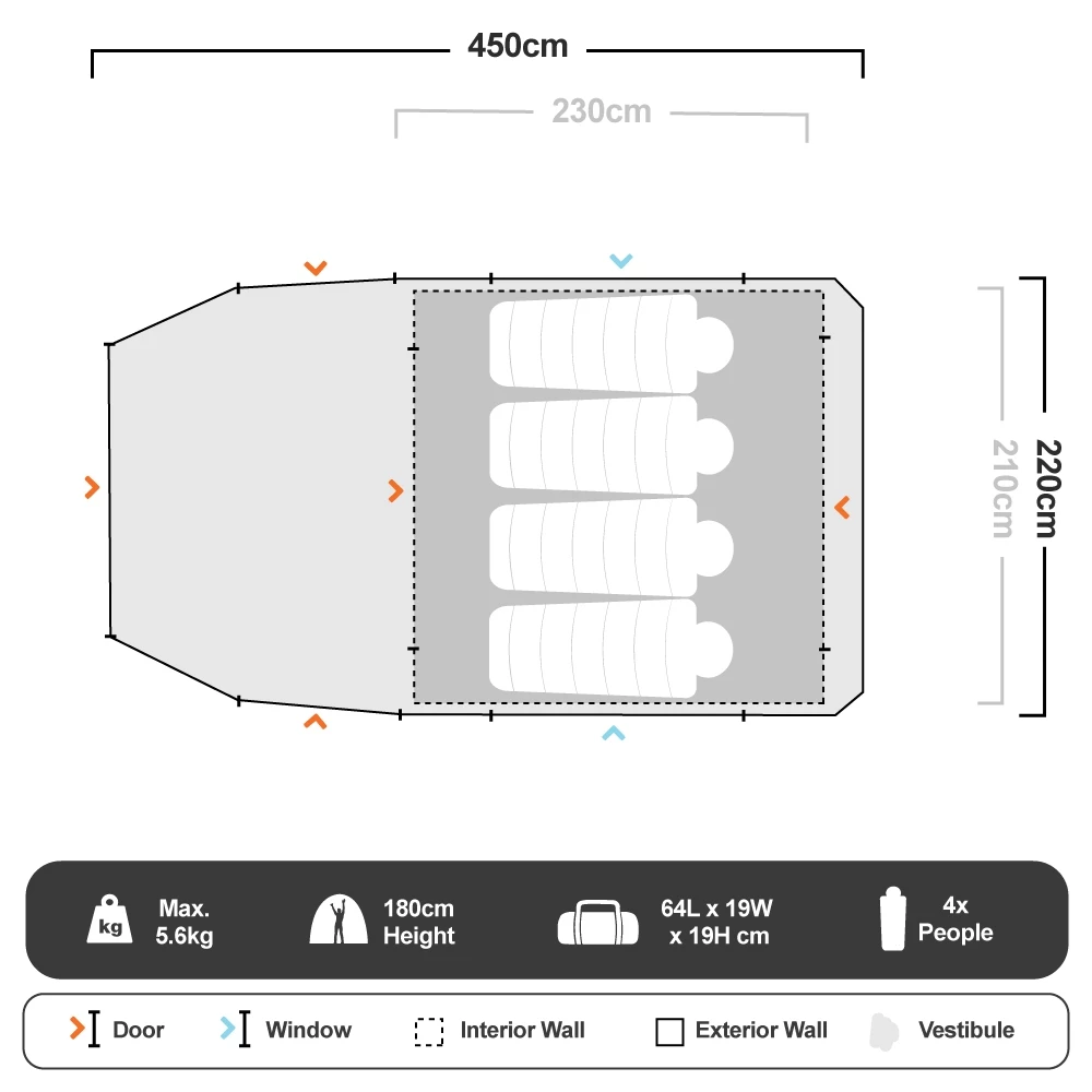 With large front and rear D doors plus a side door on the extended vestibule, this tent offers terrific ventilation to keep you cool and the air circulating. The dome design gives you a full head height of 180cm which continues out to the extended vestibule section, and with easy step doors, organiser pockets and an attachment point for your light, you’ve got total comfort and convenience at your fingertips.