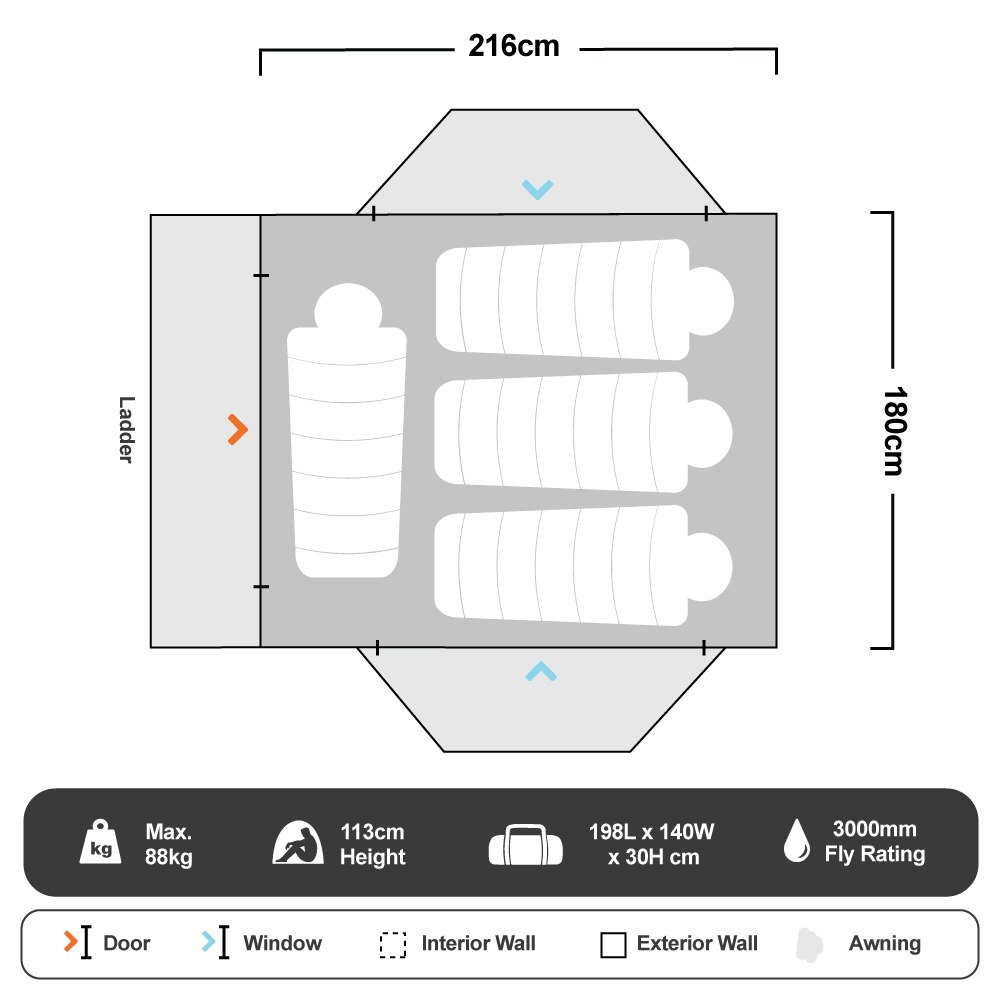 From those late pullups and departures at dawn to multi day stays and sleeping through the sunny haze – the lift and fold design enables a quick set up and pack down for any road trip timeline, while the Light Suppression Technology (LST) reduces sunlight. Strong enough to support big dreams, the two piece aluminium honeycomb baseboard is fitted with a high density mattress and polyester quilt for plush comfort out bush. Achieve optimum ventilation and a dry interior during adverse weather with arched windows on either side. Swap the city lights with the outback night thanks to a removable flysheet and stargazing roof window.