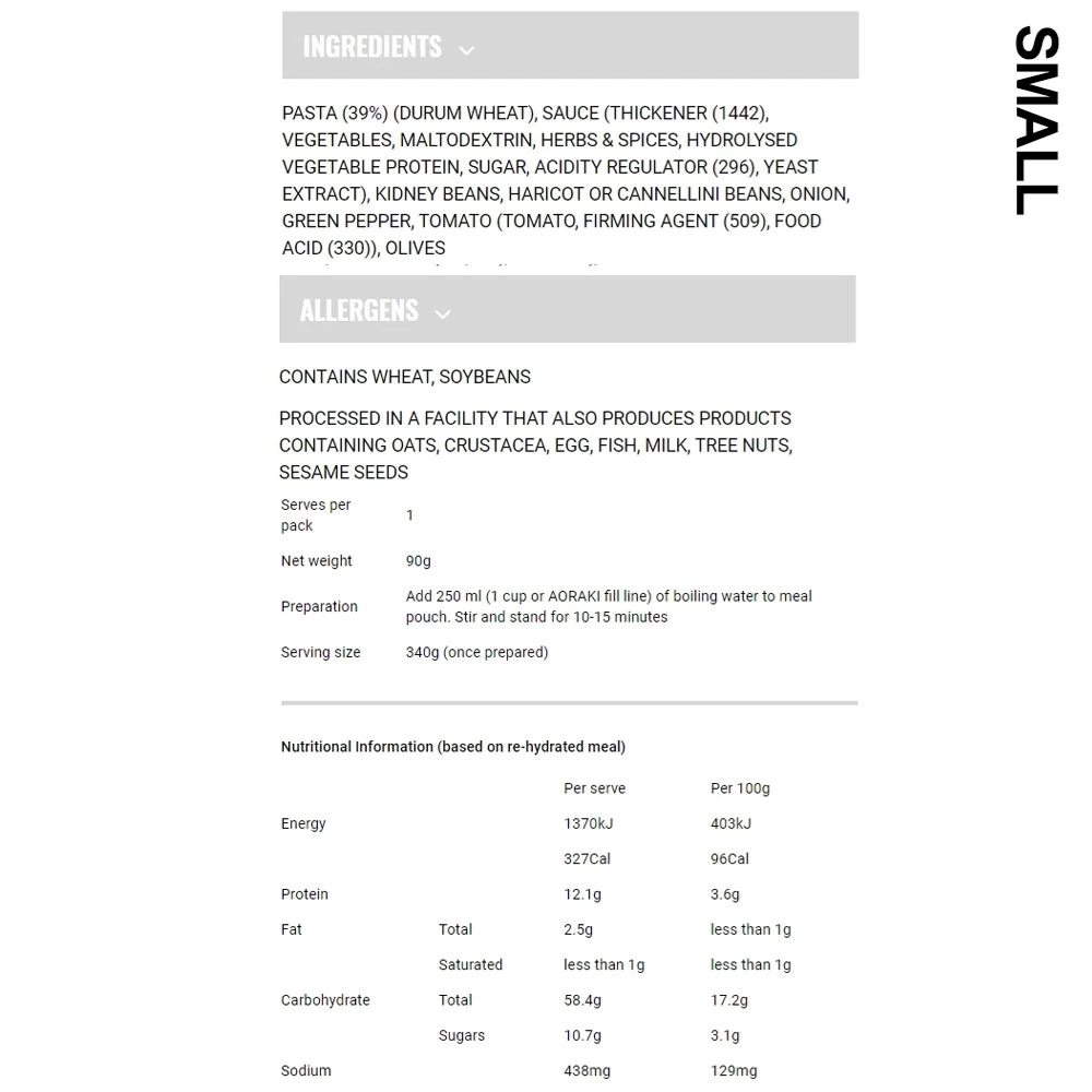 - Ingredients: Pasta 38% [Durum Wheat Semolina], Sauce [Dehydrated Vegetables (Garlic, Onion, Tomato), Thickener (1442), Maltodextrin (Maize), Herbs & Spices, Hydrolysed Vegetable Proteins (Maize, Soy), Sugar, Salt, Acidity Regulator (296), Yeast Extract, Vegetable Oil (Soy)], Kidney Beans, Haricot Beans, Onion, Green Peppers, Tomato, Olives