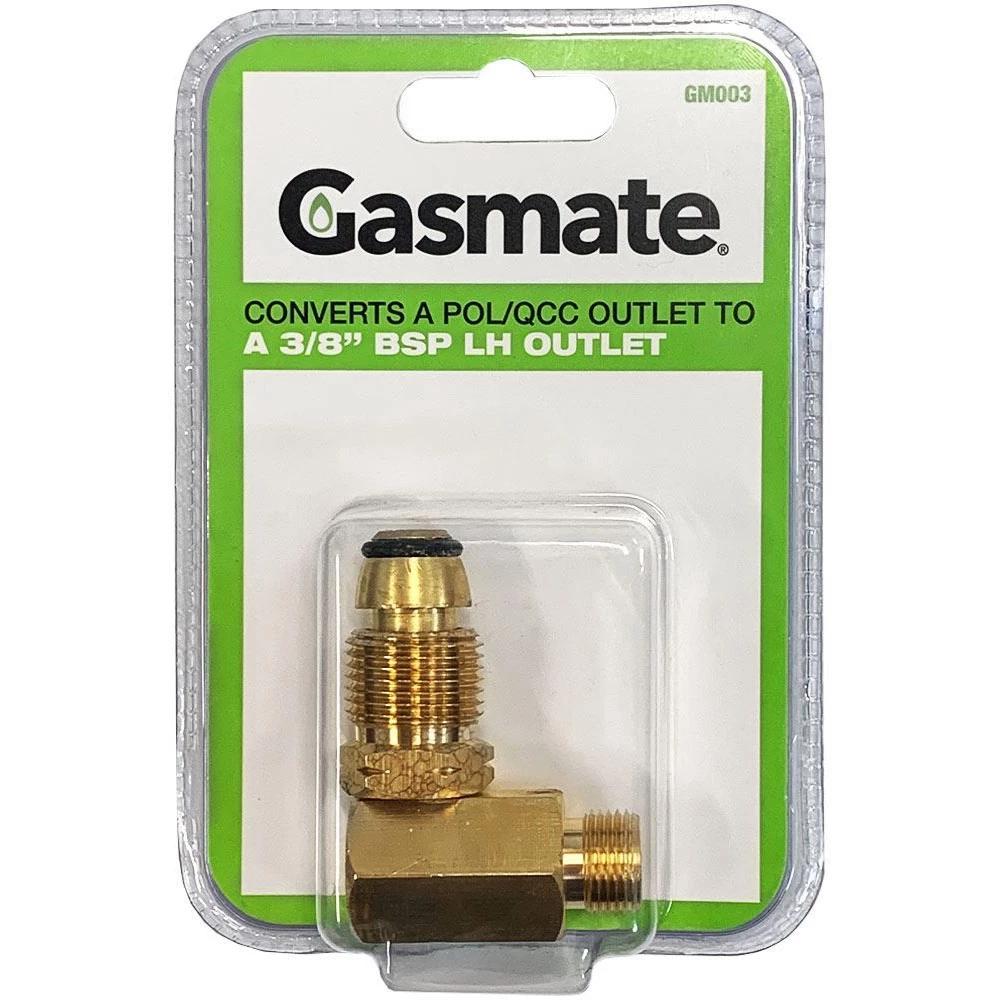 Gas cylinder adapter that enables appliances with a 3/8” LH BSP fitting to connect to cylinders with a POL outlet.