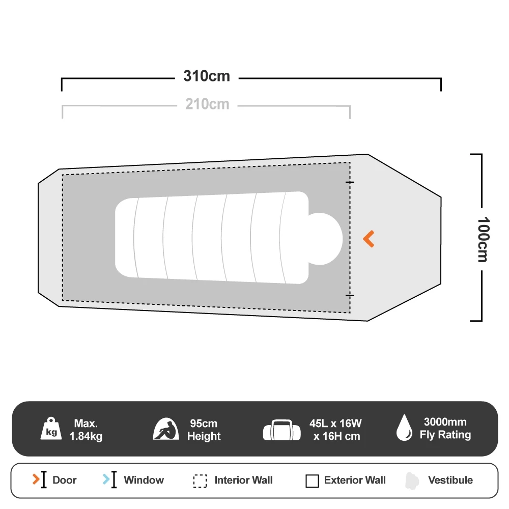 - Colour-coded poles and internal hanging room for fast, easy, all-in-one pitch