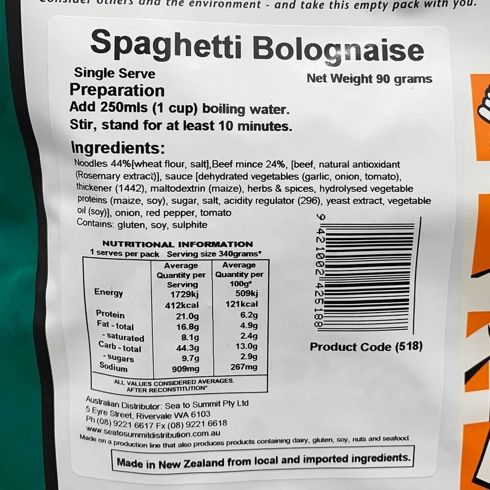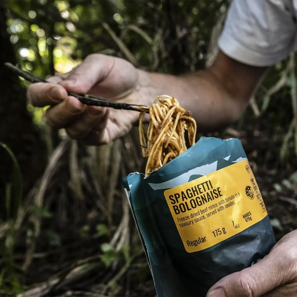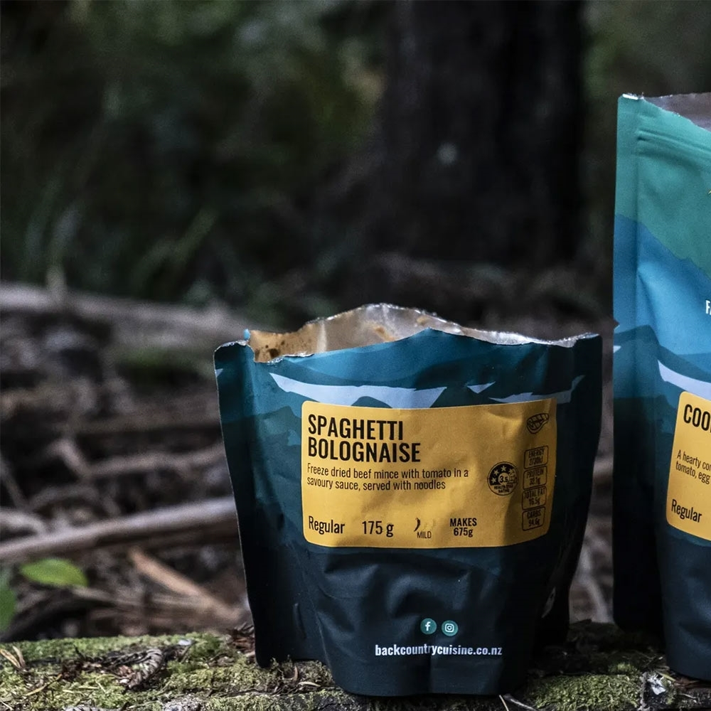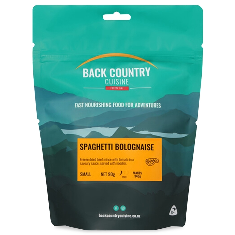 The Back Country Cuisine Spaghetti Bolognaise is comprised of tender beef mince with tomato in a savoury sauce served on a bed of noodles for a hearty meal on a lightweight adventure.