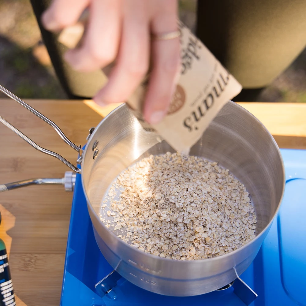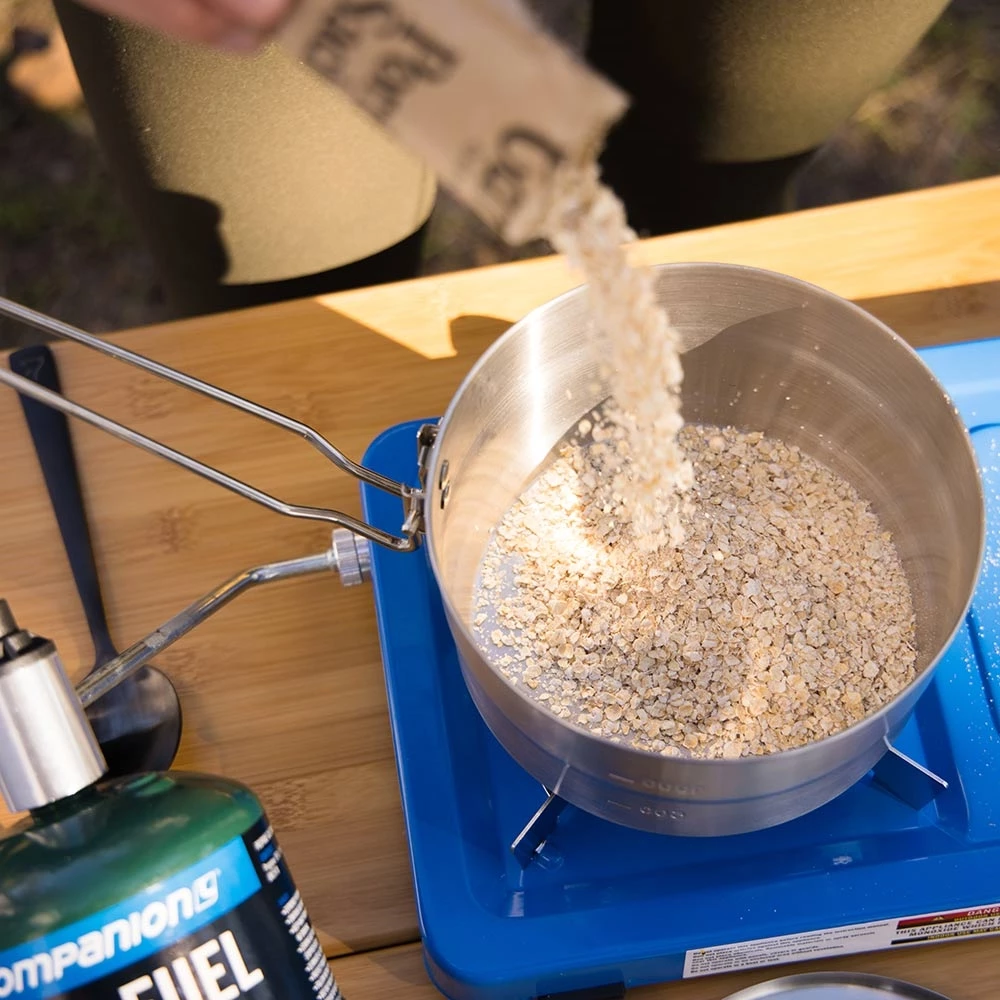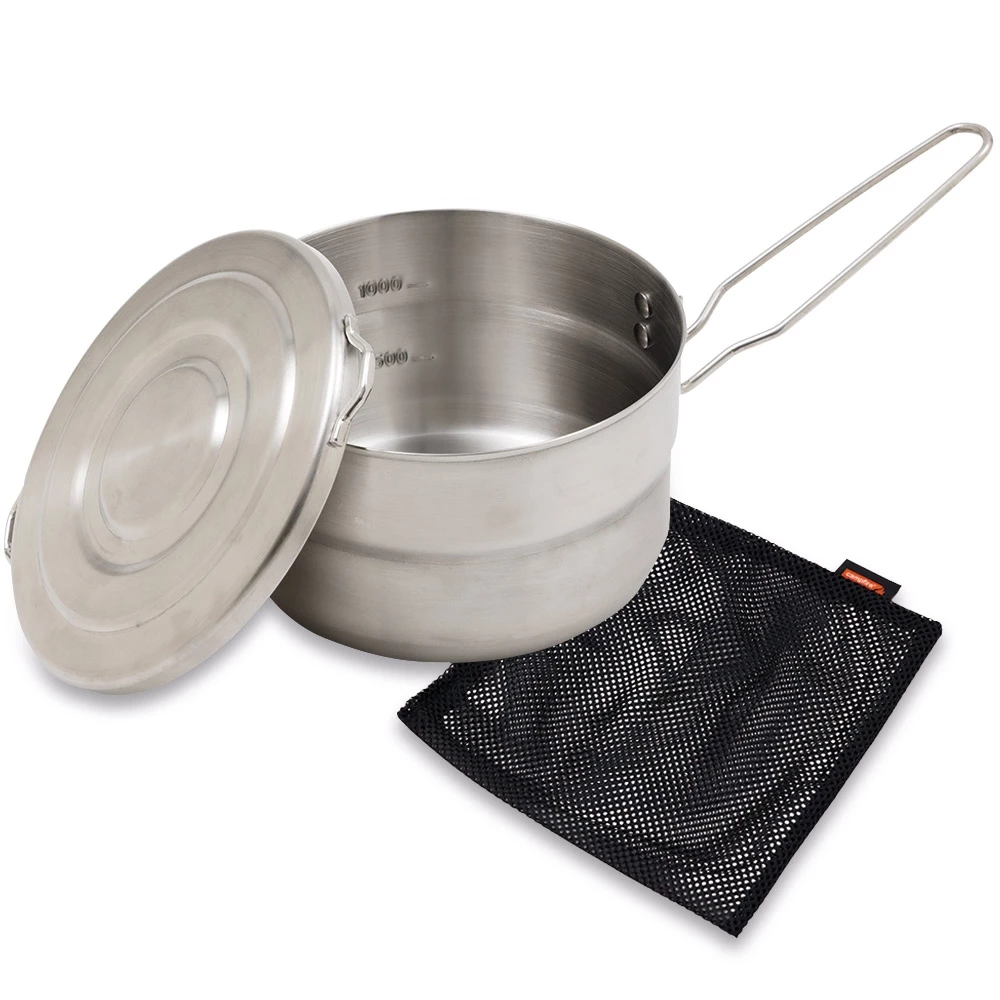 The stainless steel construction of food-grade materials features a seamless interior, guaranteeing durability in outdoor cooking chaos from the scout camps to the gram-counters on the hike track. Compact and lightweight too, this pot packs well with the rest of your camp tackle and knick-knacks, where the folding handle secures the lid for safe transit.