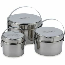 The stainless steel construction of food-safe materials guarantees durability amid outdoor kitchen dynamics. Its compact storage system has each pot nesting in another, boding well for easy stashing and safe transit. Plus, the lids can be used as plates for double the dinnertime convenience.