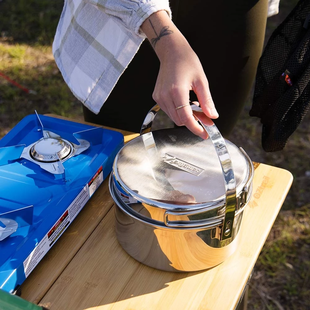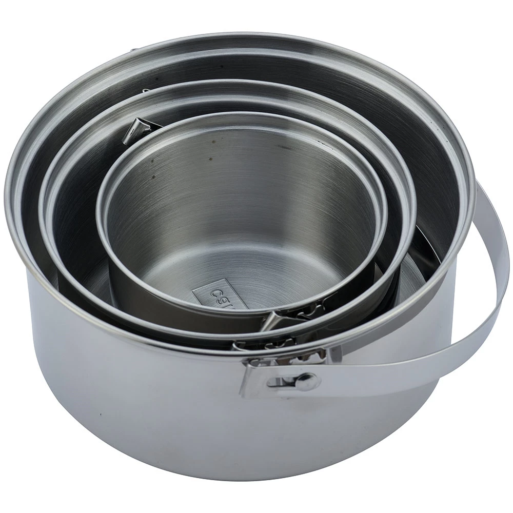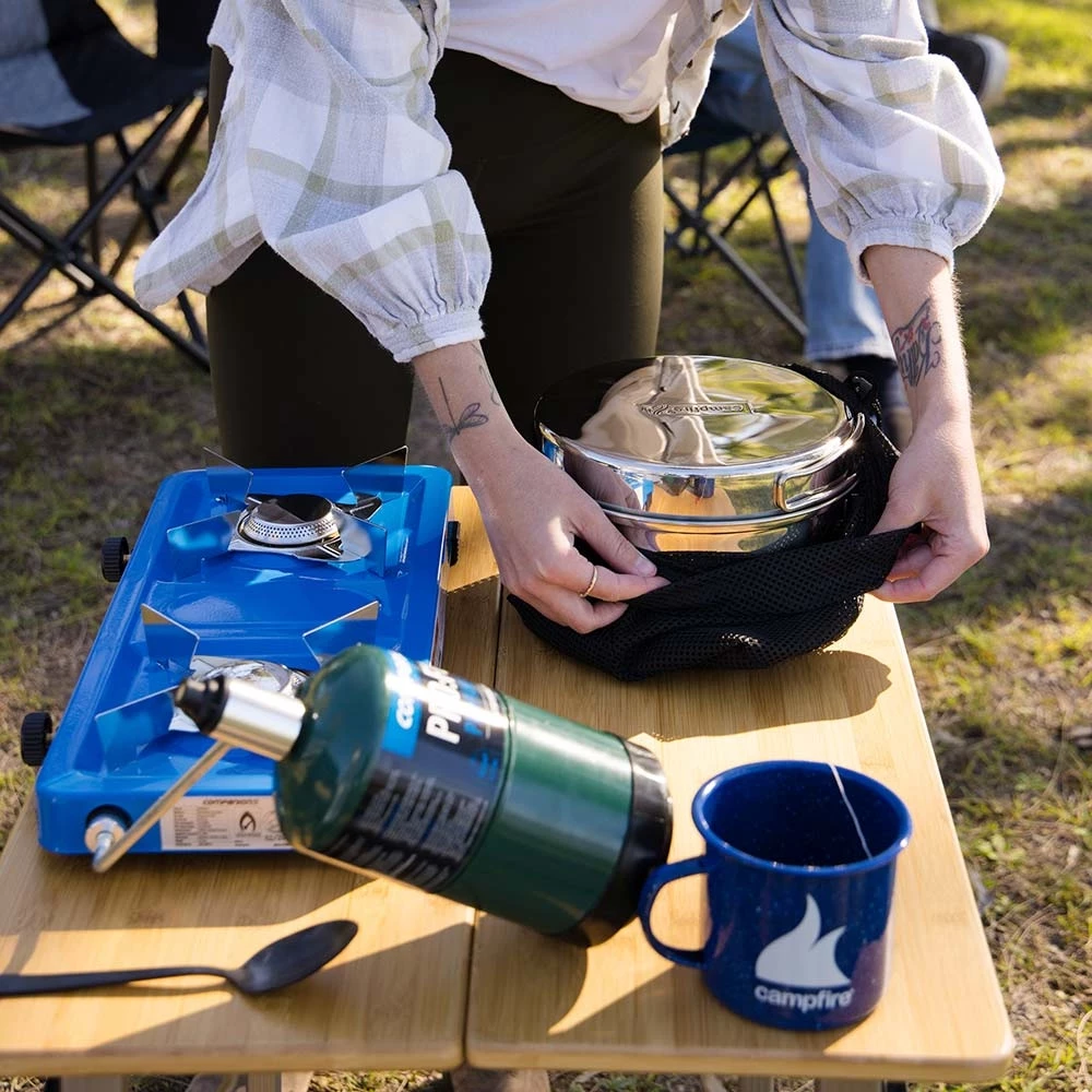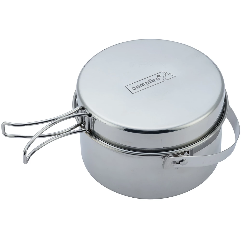 Stashed snug in the included mesh storage bag, the Campfire Stainless Steel Pot Set 6-Piece delivers bolstering outdoor dinners to feed the family.