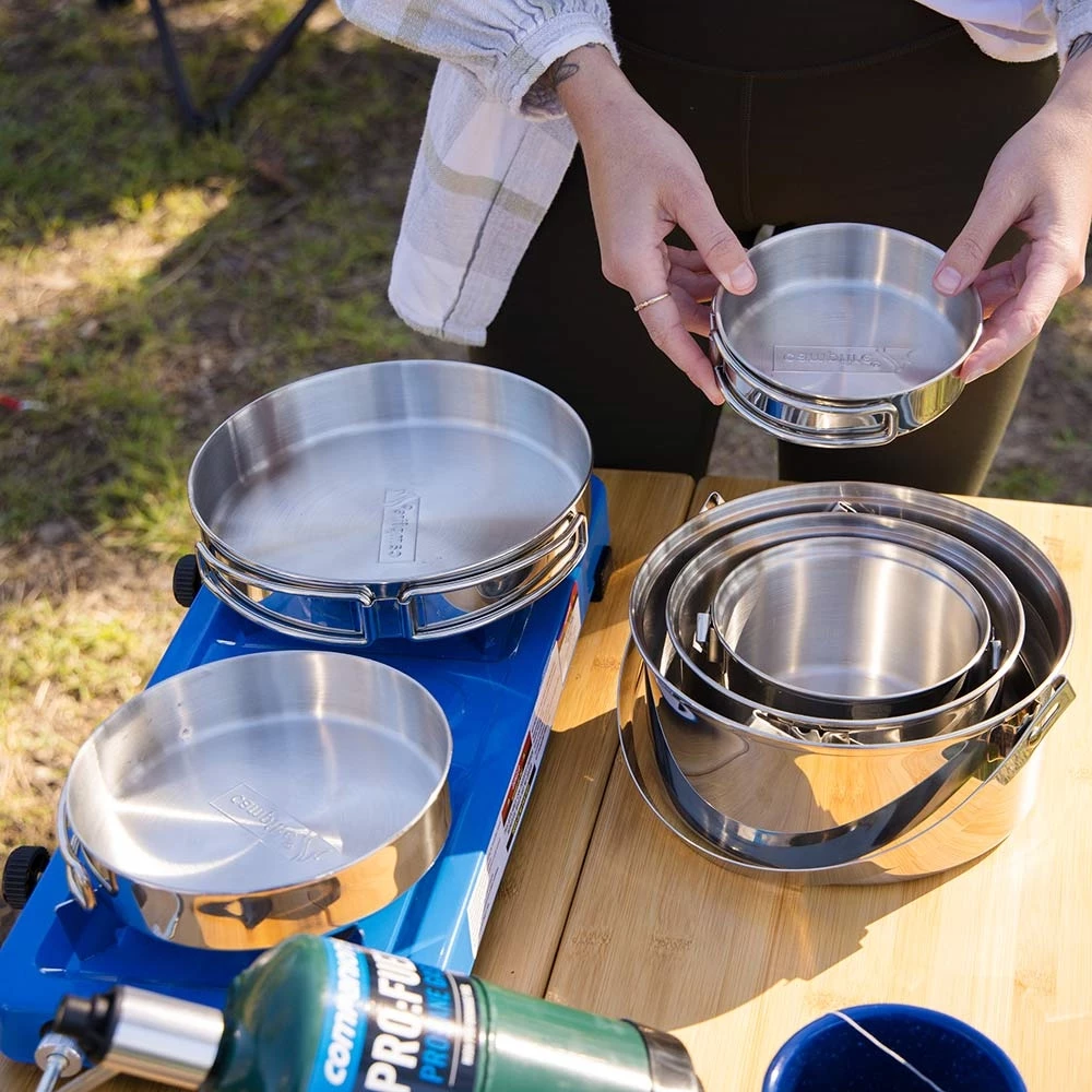 The Stainless Steel Pot Set 6-Piece by Campfire is the perfect meal prep set for those family campsite feeds.