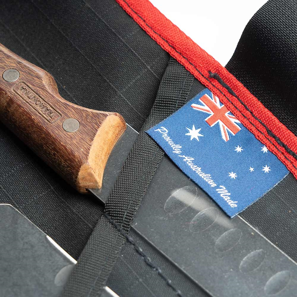 Each boasting a blackened stainless steel blade and a stylish yet ergonomic wooden handle for comfort that’s classy, these knives slice clean without trimming the fat on their substantial yet modest weight in hand. The included carving knives also feature grooves that create air pockets to encourage non-stick, slick cutting. Plus – like chicken breast in bacon, these slicers ‘n dicers come wrapped snug in an Aussie-made AOS canvas wrap.