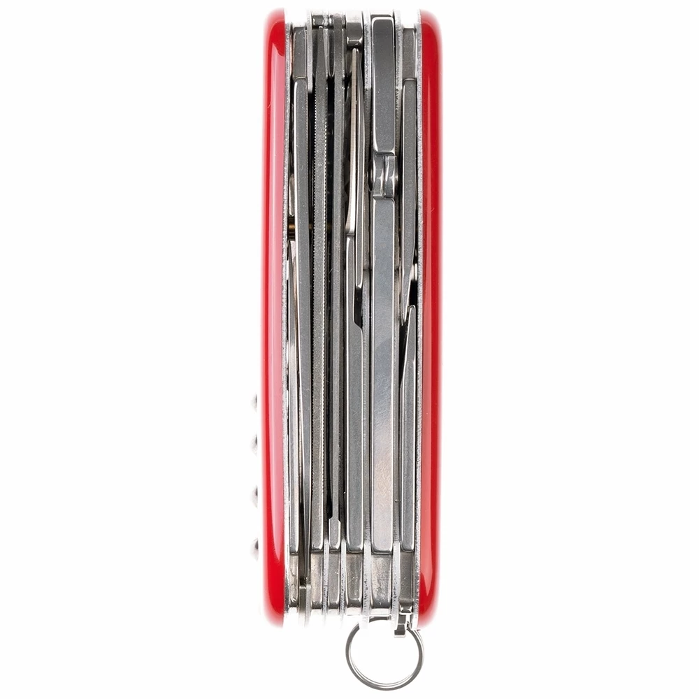 - Features: Large blade, small blade, can opener, 2mm, 3mm and 5mm screwdriver, wire stripper, reamer, punch, sewing awl; corkscrew, scissors, pliers, wire bender, wire crimper (inside-outside), wood saw, nail file, metal saw, metal file, nail cleaner, 4mm chisel, multipurpose hook, toothpick, tweezers, key ring